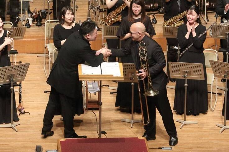 アンコールは、トロンボーンをフィーチャーした酒井格作曲『スライダーズ・ミックス』をアレッシ氏にオオサカンのトロンボーンセクションが加わり演奏。遊び心あるスライドの動きや楽しい曲調も相まって和やかな雰囲気となりました。