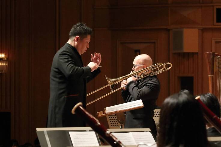第一部に演奏した『コンチェルティーノ 変ホ長調』はトロンボーン奏者にとって重要なレパートリー。氏による精緻な音楽表現はもちろんのこと、カデンツァでは卓越したテクニックが披露されました。