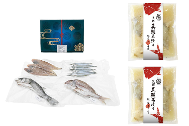 ●天然真鯛茶漬けと、小倉商店自慢の干物セットです。ご自宅の食卓で、ご夫婦で、お子様と、お楽しみいただけるようなセットに仕上げました。