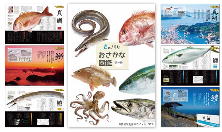おさかな図鑑 概要(予定): オールカラー102ページ 内容 魚種11種の紹介 (マダイ・サワラ・カツオ・ハモ・アユ・マダコ・アコウ・ガザミ・カワハギ・トラフグ・ブリ)