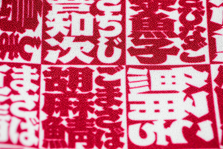 ②さかなへんの漢字がずらっとならんだおさかな漢字柄Ⓐ紅(べに)色