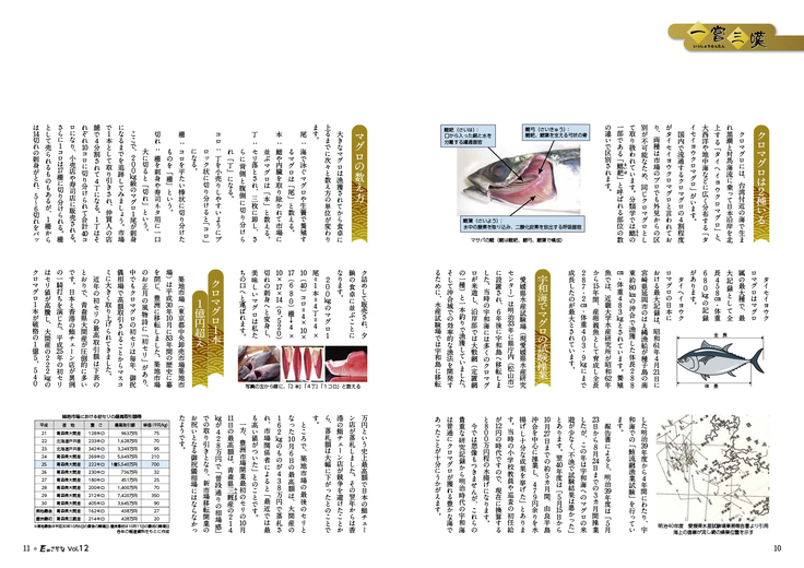 A4オールカラー100ページ 魚種12種の紹介 (クロマグロ、真珠、ホタルジャコ、カタクチイワシ、シマアジ、アナゴ、ケンサキイカ、マアジ、マサバ、甘鯛、ヒラメ、スマ)