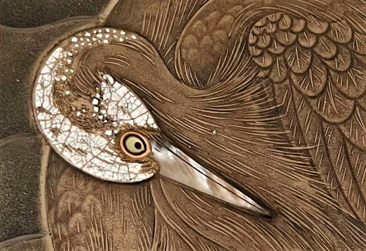 手前の鷺の顔部分には卵殻(うずらの卵の殻を使用します)と螺鈿(貝殻の内側を使用します)