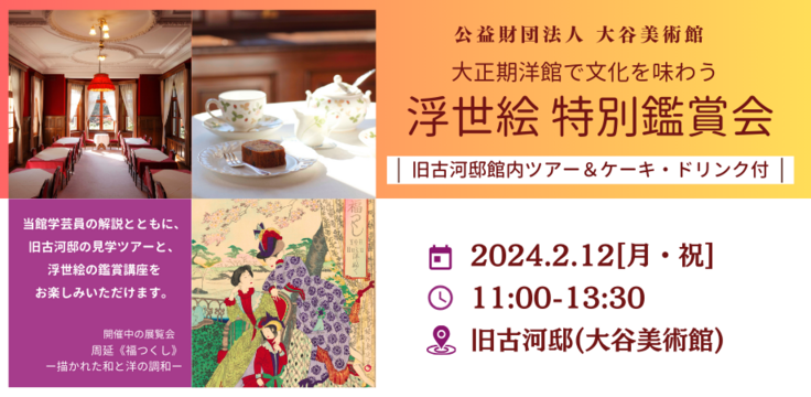 旧古河邸の建物見学・浮世絵展示のギャラリートーク・浮世絵鑑賞講座をお楽しみいただける企画です。