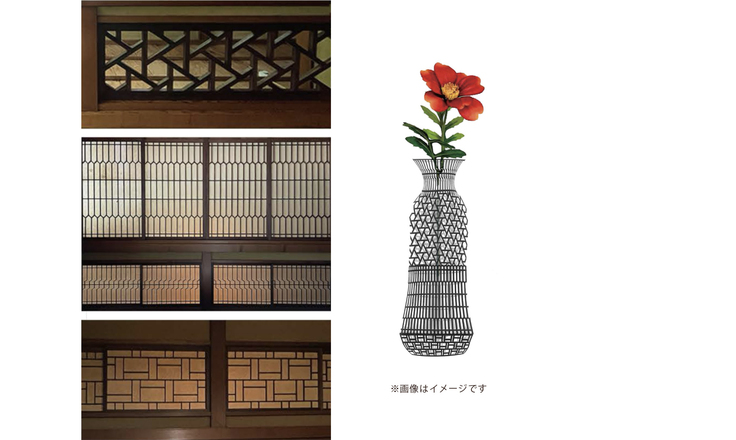 銅御殿は、部屋ごとに趣の異なる障子の桟のデザインを楽しめます。現代でもまったく色褪せない、そのリズミカルな意匠イメージをフラワーベースにしました。