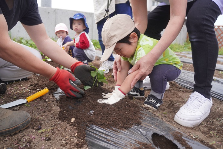 前日までの低温や雨が嘘のように、陽気と晴天に恵まれた絶好の畑日和! 園児たち14人は軍手をしっかり着用し、職員が掘っておいた穴に丁寧に苗を入れ、元気に育ってねと願いながら土をかぶせ、皆笑顔で作業を終えました。