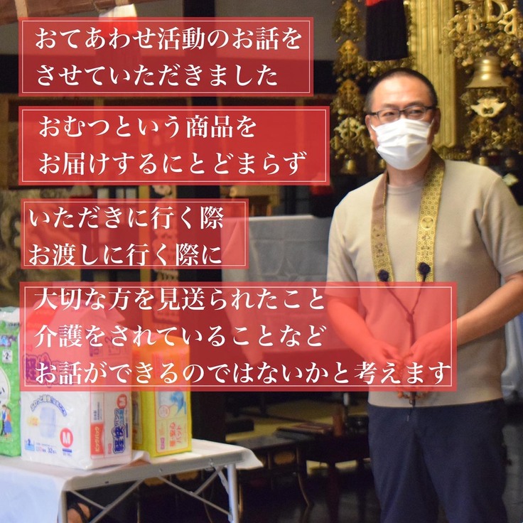「おしょうさん、どうかこの介護用おむつをお役立てください」