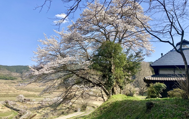 写真は昔から宿にある立派な桜の木。今まさに満開を迎え、目を見張る美しさです。