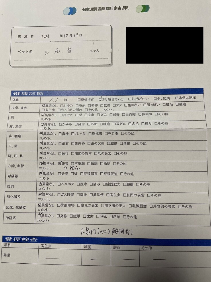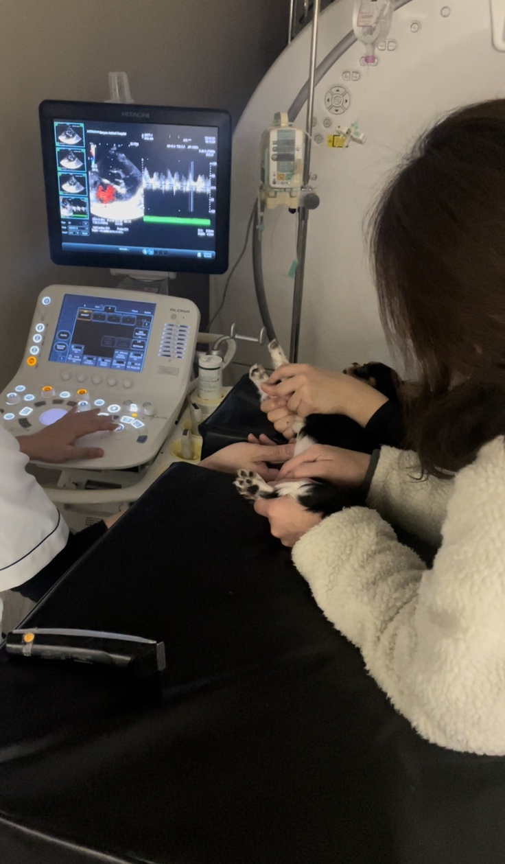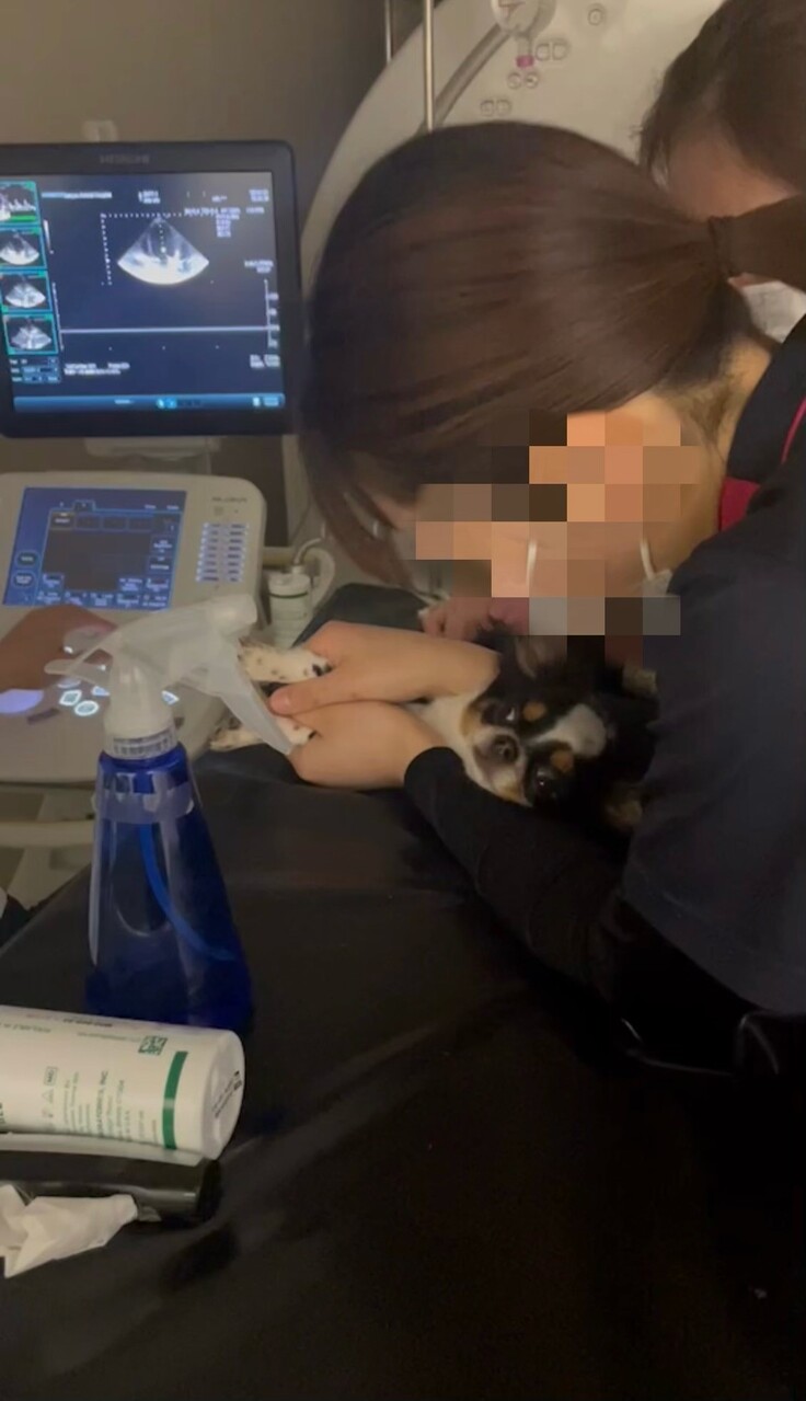 家族に迎え入れた2週間後、健康診断と予防接種を受けに動物病院を受診しました。その時、心雑音の指摘を受け詳しい検査を2日後に受けました。検査の結果は先天性の心疾患で動脈管開存症(PDA)と告知されました。主治医からこの病気は1歳未満で心不全を発症することがほとんどで、治療を行わなかった場合は診断から1年後には生存できるワンちゃんは少ない説明を受けました。治療方法は、動脈管を閉鎖させる薬は無いため服薬で治す事はできず外科手術のみです。元気に育つと思っていただけにとてもショックでした。