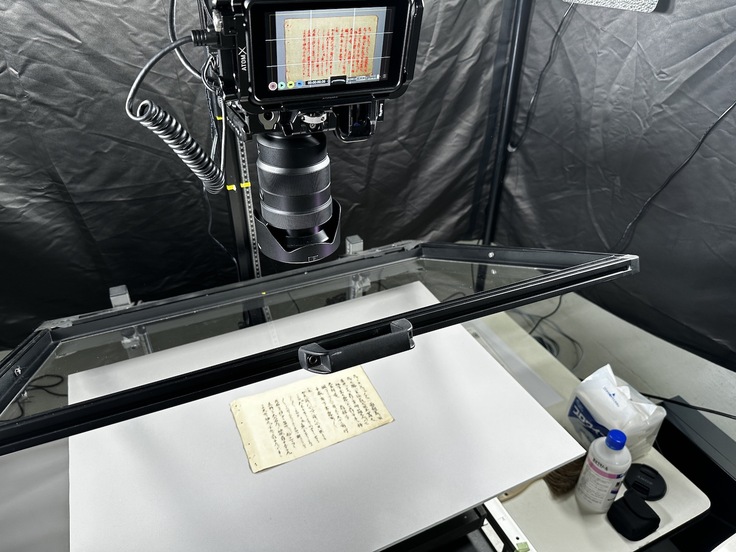 撮影は台本を痛めないために和綴を一度解いて解体し、一枚一枚を開いた状態にしてから撮影されました。撮影に使用したのは、1億200万画素の高精細デジタルカメラです。高精細のカメラでデジタル化したことで、資料の細かな文字も判別でき、拡大してもストレスなく読むことができます。