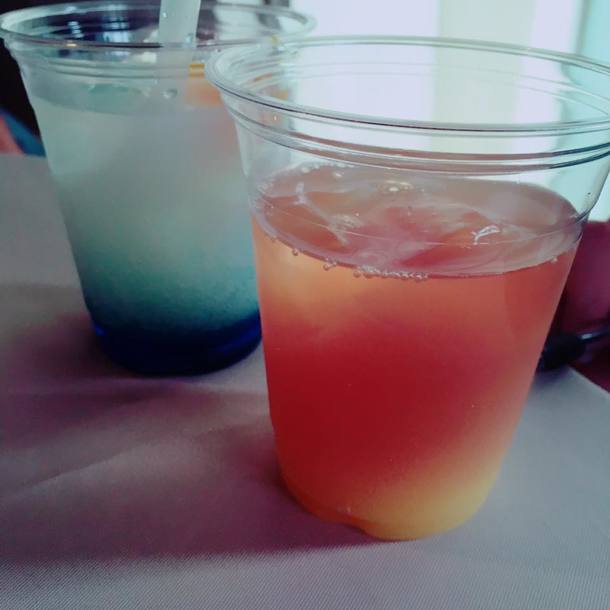 メニューも悩めばネーミングも大事!左の青と白のグラデーションは「夜空のサイダー」右のオレンジ色のジュースは「夕焼けの気持ち」かなー。