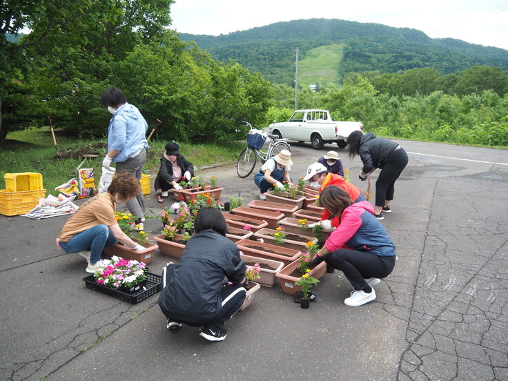 当日は、一般村民や高校生の皆さんがお手伝いで参加いただき、プランターへ植える作業を行いました。後日、プランターは音威子府駅と天塩川温泉駅に設置し、また別に筬島駅と咲来駅の花壇も整備をする予定です。