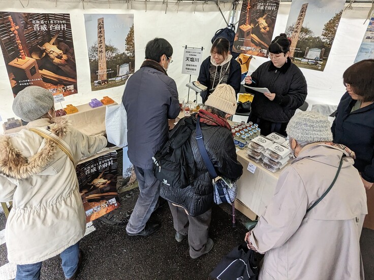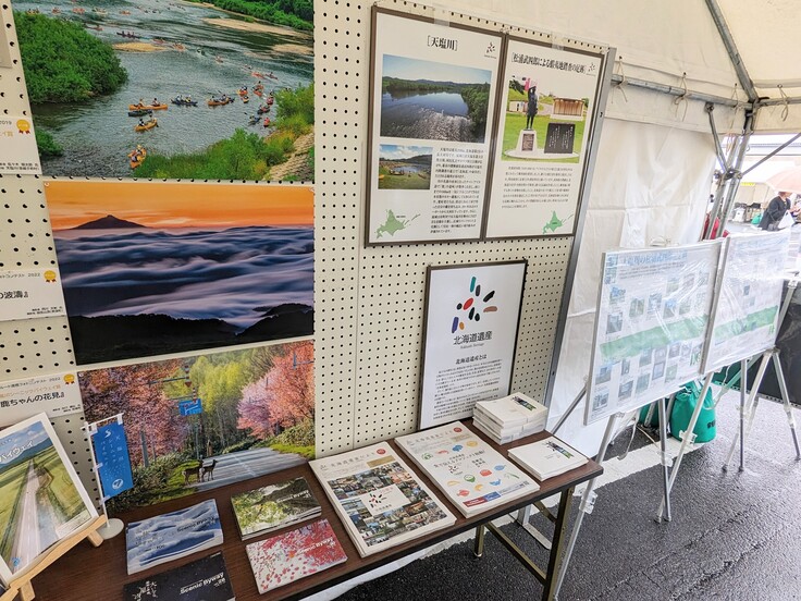 イベント当日はあいにくの雨模様でしたが、天塩川や道北地方、北海道遺産に関するパネル展示ブースには、多くの方々にお立ち寄りいただき、たくさんお話しもすることができました。特産品販売も好評で、用意していたものもすべて完売するほど盛況でした。
