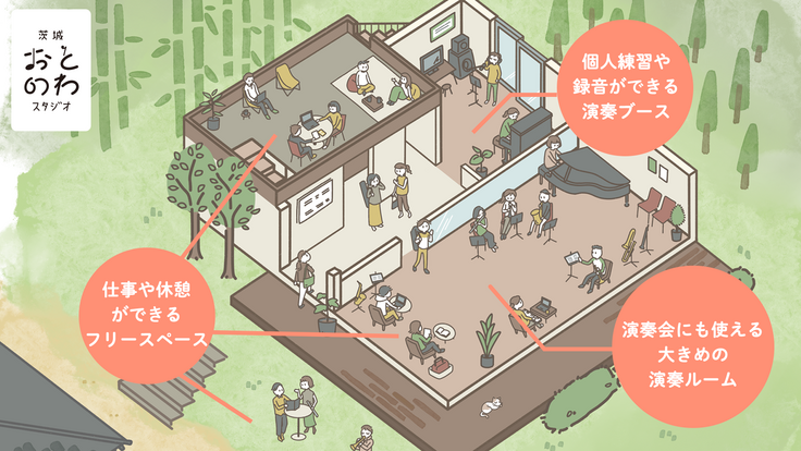 そして今回、「おとのわ」の目標である「音楽のある豊かな日常」の実現を目指して、「演奏できるコワーキングスペース」を豊かな自然に囲まれた茨城県石岡市に開設します。この場所を通して地域で音楽に触れ合える機会を増やし、「音楽のある豊かな日常」を作っていきたいと考えています。2022年9月開設を目指して現在準備を進めています。