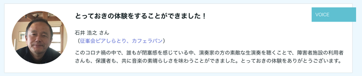 こちらの仕組みを是非多くの方にご活用いただき、演奏家と地域のマッチングが促進されることを目指していきたいと考えています。