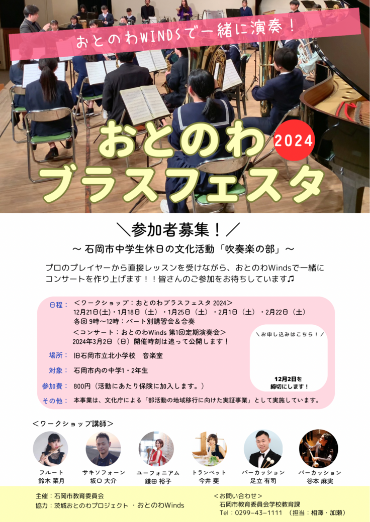 「おとのわブラスフェスタ2024」と題し、茨城出身・在住のプロプレーヤーのみなさんを講師としてお迎えし、レッスンを受けながら3月2日の第1回定期演奏会に向かいます!