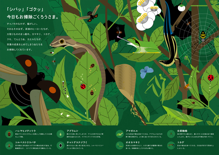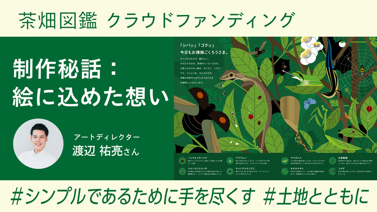 茶畑図鑑には、茶畑で見られるさまざまな生き物たちが登場します。土の中で暮らす目に見えない微生物たち、昆虫、鳥、鹿といった動物たち…。それぞれのページにテーマがあり、有機栽培に切り替えたことで豊かになった茶畑の多様な命や、それらのつながりを色鮮やかに、ダイナミックに描いています。また、茶畑に必要な太陽や宮崎県川南町の気候についても触れており、楽しく眺めながら自然の生態系について学べる絵本に仕上がる予定です。