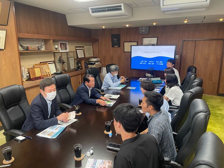 今回のパンフレット制作について、大学生より役場(町長、副町長、担当課長)へご報告いたしました。今回のパンフレットを制作した目的や、設定したターゲット、デザイン上の工夫などをご説明しました。