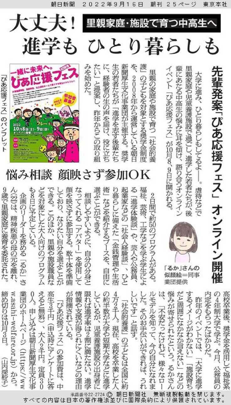 さて、9月16日の朝日新聞朝刊に、応援生が中心になって企画、準備をしている「ぴあ応援フェス」が取り上げられました。