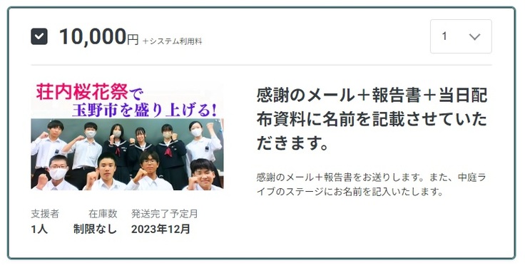でございます。10000円のリターンの説明欄に中庭ライブのステージにお名前の記載があったため誤った記載となっておりました。間違った記載をしてしまい、たいへん申し訳ありませんでした。