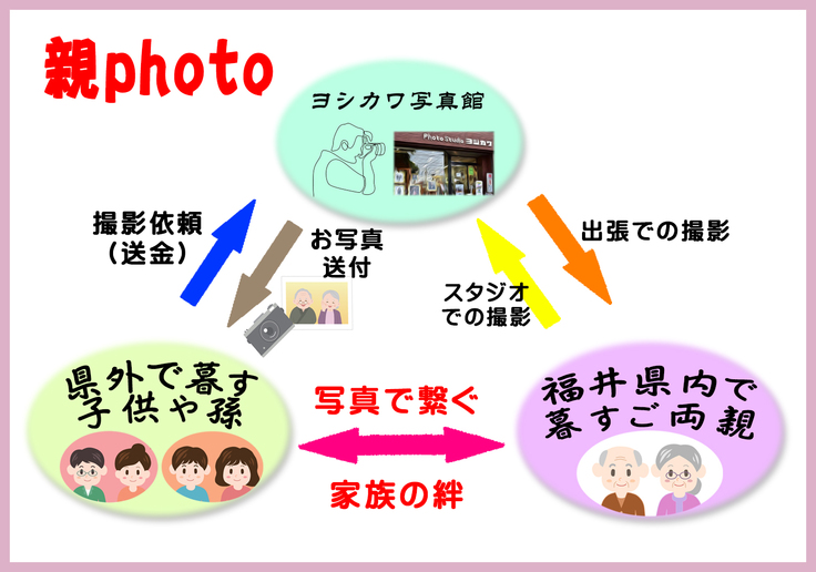 福井に住む、おじいちゃん、おばあちゃん、親御さん等のご家族のお写真を、遠方に住むお子様、お孫さんに代わり、私たちが撮影します。