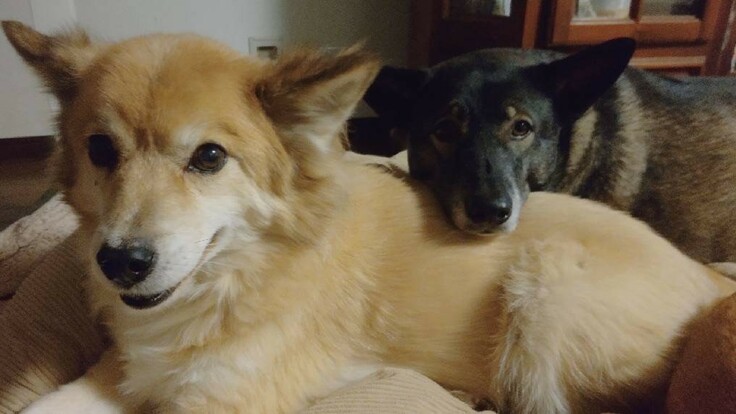 福ちゃん(左)は3本足の野犬が産んだ子です。親子で環境の厳しい山の中で暮らしていました。10年以上前に親子全員捕獲して、たんぽぽを立ち上げる前から代表と暮らしています。母犬は老衰でお星さまとなり、昨年兄弟の亀もお星さまとなりましたが、兄妹の福と梅子はまだまだ元気です。生粋の野犬で、代表以外の人間は触れないので里親には出さずに、終生共に暮らします。