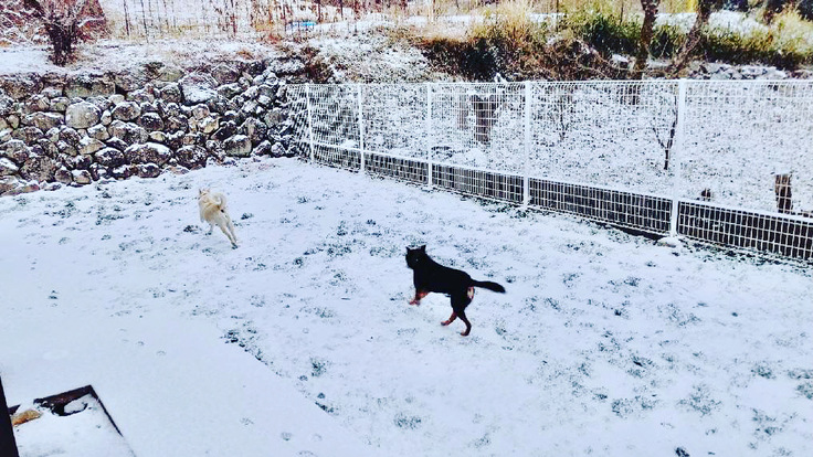 モモと黒と2匹がいますが、モモは雪と一体化しています。