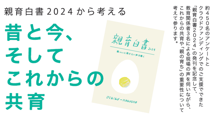 今回は約450名のアンケートとクラウドファンディングでのご支援でできた「親育白書2024」の発刊を記念して、教育関係者3名による現場の声を伺いながら、これからの共育や「親の育ち」の重要性について考えて参ります。