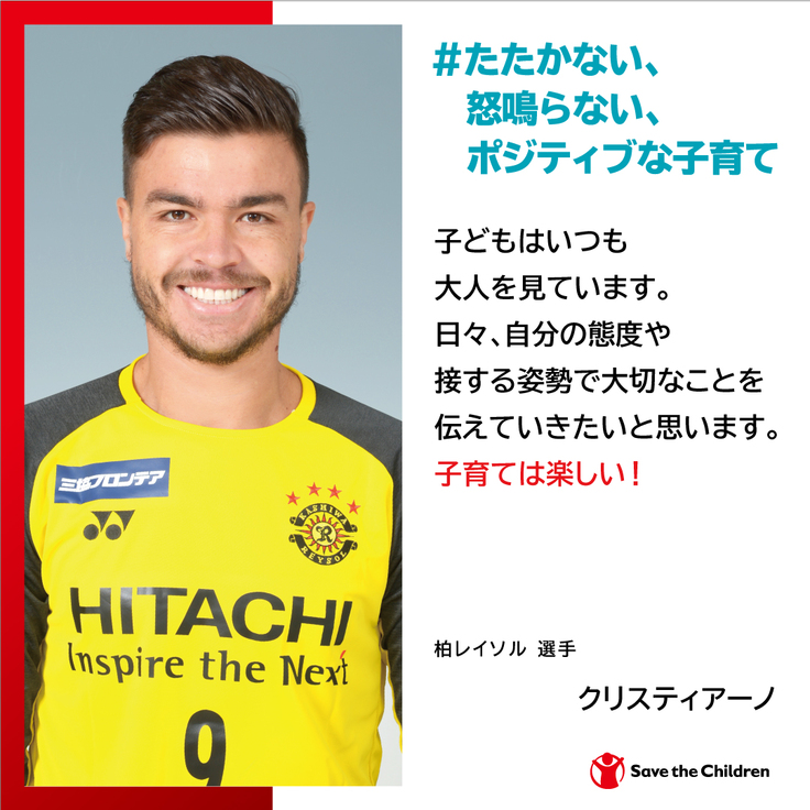 柏レイソルとセーブ・ザ・チルドレンは、2015年より、体罰等を用いない「たたかない、怒鳴らない、ポジティブな子育て」 を広める活動をともに実施しています。
