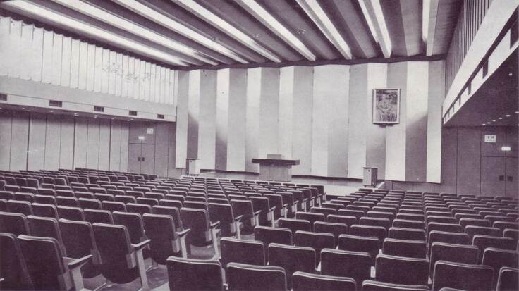 さて講堂は、講演本位の建前をとったため、肉声でも充分に聞き取れる「反響の良い講堂」の設計ということになって、NHK放送技術研究所の協力を得る事に成功した。同研究所は、設計図を詳細に検討修正を加え、音響効果の測定など、約半年にわたる技術指導を行い、今日の講堂ができた。