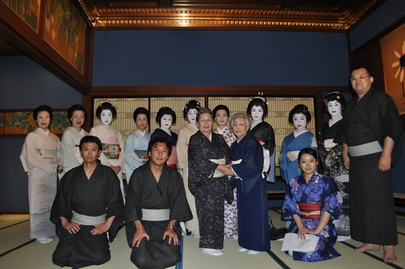 (2011年8月のお座敷遊び大宴会の時、お呼びした芸者衆と日本お座敷遊び協会のメンバーです。中央で手を握っているお姐さんの右側が艶子姐さんです。)