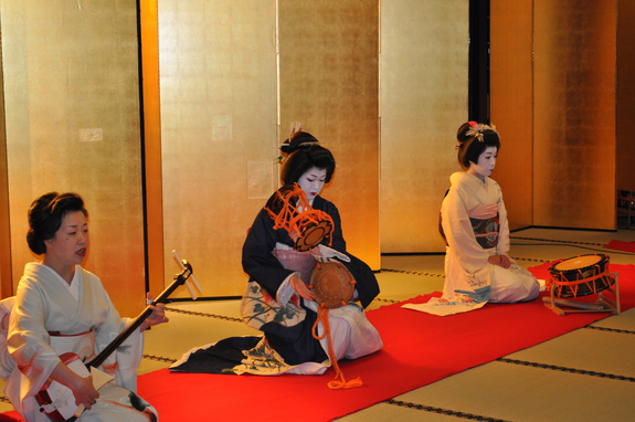 (2011年8月に開催したお座敷大宴会です。艶姐さん、恵姐さんによる三味線で八王子花街芸者衆を釜石の芸を披露しています。)