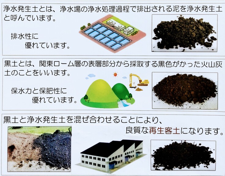 水道水を作る際に発生する循環資源である浄水発生土は毎年安定して発生しており、なおかつ天然資源の黒土と混合することにより保水性が向上し、良質な園芸土となります。