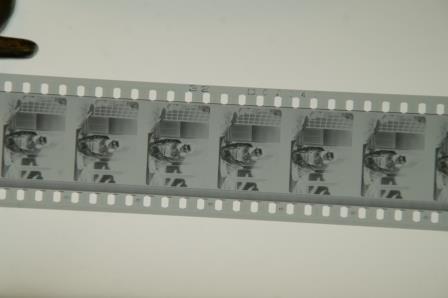 晩春のネガフィルムです。フィルムは本来、適切に保管しないとゆがみが発生したり、(カラー作品の場合)退色したりしますが、現在のテレビ放送されている映像(ハイビジョン映像)よりも豊富な情報量が収められています。