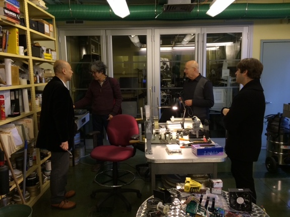 写真の左側にいる方(暗くてすみません)が以前メッセージも頂いたシネリック社の創始者でもあるバラジ・ニアリ社長です。奥に見える機械が、今回「晩春」を修復するために使用した4Kスキャンのカメラになります。右側の写真の方はプリントの状態を確認するヤノス・ピレンイさんで、この方はスコセッシ監督の「タクシードライバー」のポストプロダクションも手がけ、その後、自ら修復もされた方です。
