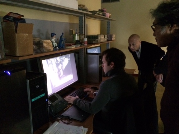 右の写真は、インドの修復会社から送られてきた、パラ(付着物)やキズが消されたデータをさらにチェックして、より良いものへ仕上げるために一つ一つのコマに手を入れているところです。