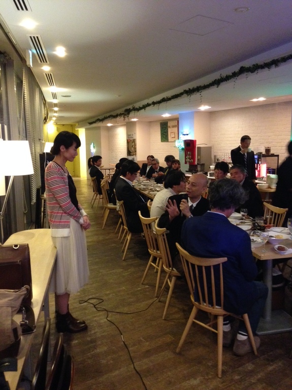 試写会終了後には、サポーターの方々と、修復作業の関係者たちが集い、小津について語り合うアフターパーティーが催されました。食事とお酒を楽しみつつ、いちばん好きな小津映画はどの作品か、次に修復すべき作品は何だろうか、と話題は尽きません。近森眞史撮影監督はじめ関係者への質疑応答においても、さすが小津愛・映画愛に溢れたご支援者の方々、鋭くも的確な質問が投げかけられました。