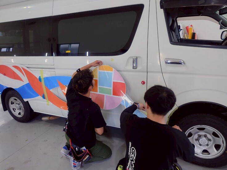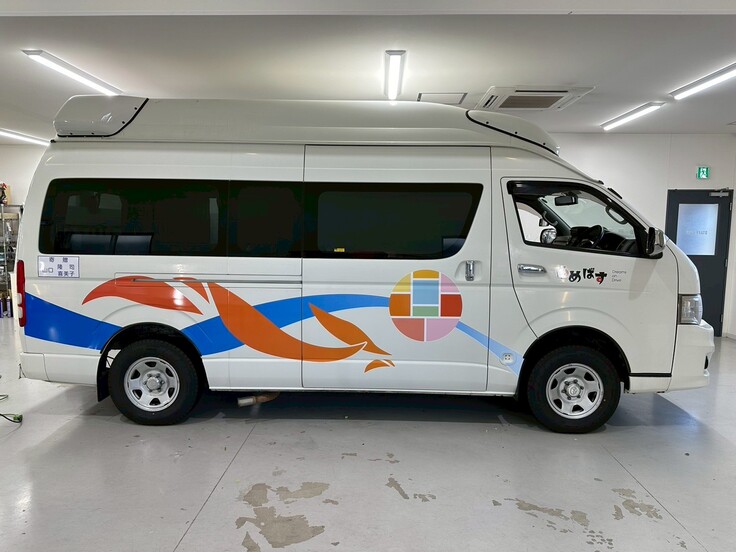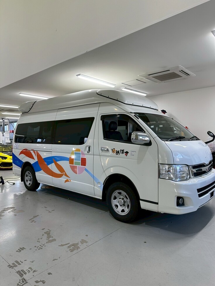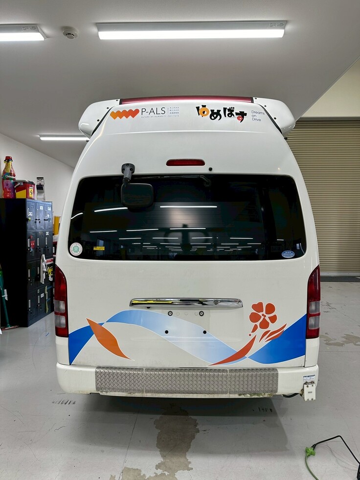 ラッピング作業を担当してくれている、神奈川県寒川のGマイスター社から、外装作業過程の写真が送られてきました!救急車だった面影はもはやなく、夢をのせて進む車両ゆめばすへ大変身中です。