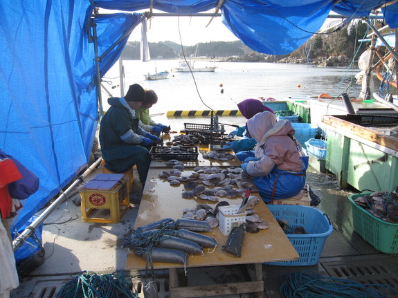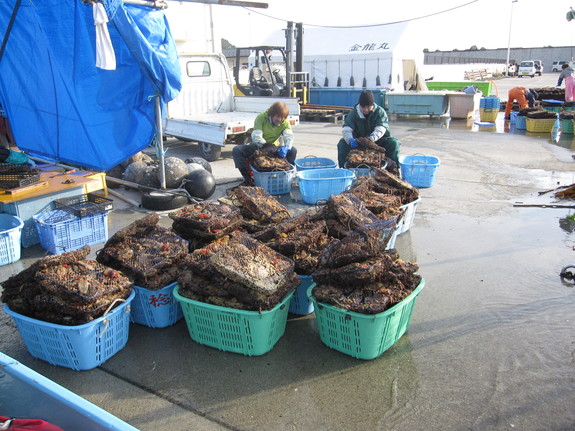 今日の活動は、広田町の漁港でホタテ養殖のお手伝いでした。