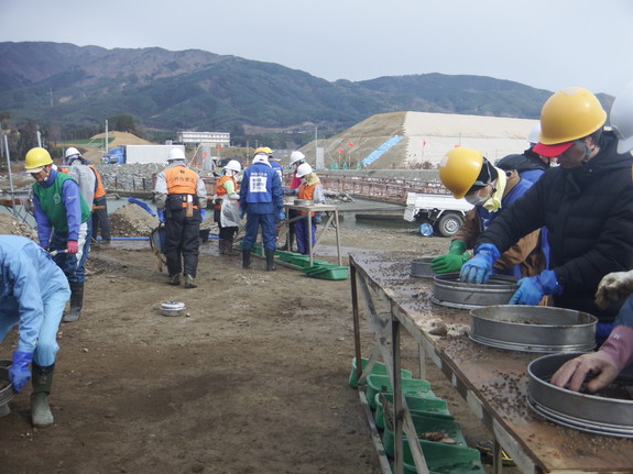 13日の活動は高田町の古川沼で振るいを使っての遺留品捜索と、気仙町の道路を見晴らし良くする為の草刈り、広田町のホタテ養殖のお手伝いでした。