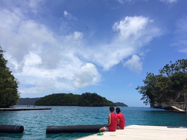 パラオのきれいな海に、修繕された桟橋の白とTシャツの赤が映えますね☆