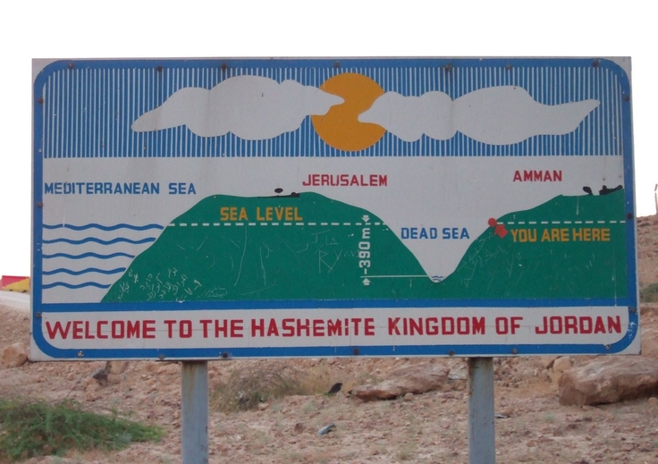 *本企画の事業実施地域は、パレスチナ自治区ではなく、隣国のヨルダンです。ヨルダンはイスラエル/パレスチナと長い国境線で接し、国民の多くをパレスチナ出身者が占めます。(下の地図の左の丘がイスラエル/パレスチナで、死海(Dead Sea)をはさんだ右の丘がヨルダン。写真は2009年8月撮影)