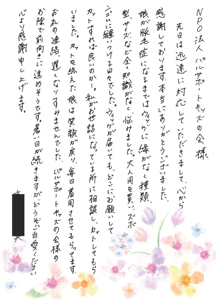 本日は、パルサポートキッズの会のウィッグをご利用いただいた方からいただいたお手紙をご紹介いたします。