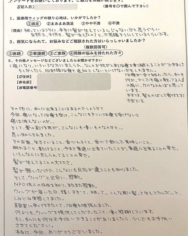 美容室に早く行きたくて、治療も頑張れました。何よりも、ウィッグを提供してくださったこと、凄く感謝しています。