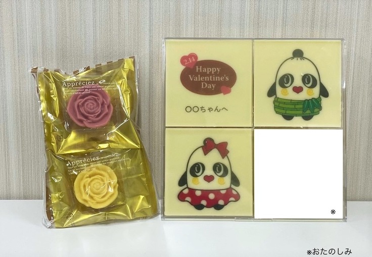 ※ぱんだーるくんをプリントしたチョコと、ばらの形をしたチョコの詰め合わせをお送りします。「○○ちゃんへ」の○○の部分にお入れするお名前をお知らせください。