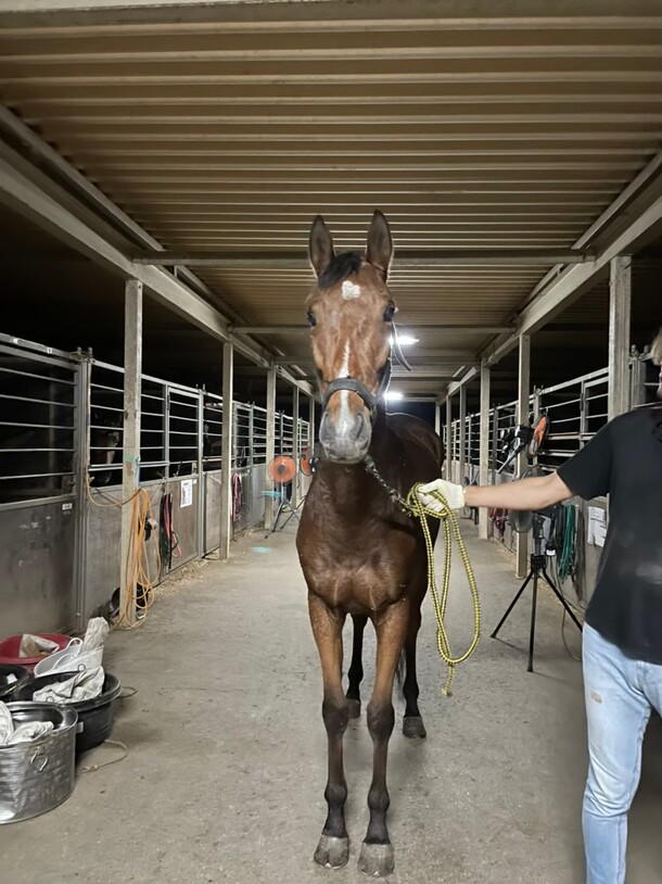 バジガクの馬運車に乗った後、怖い場所へ連れて行かれると思って恐怖を感じたのか、落ち着かない様子で緊張して汗をかきはじめ、バジガクに到着した時には冷や汗で体の毛がぺったりとしていました。