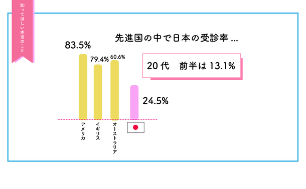 しかし現在、ワクチン接種率は1%以下、検診受診率は40%(*3)と、先進国のなかで飛び抜けて低いのが実状。