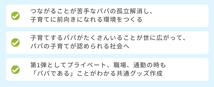 パパの存在が社会全体に認知されていけば、きっと、パパと何かをつなぐ関係性が生まれて、そこにあった孤立や悩みは少しずつ消えていくはずです。