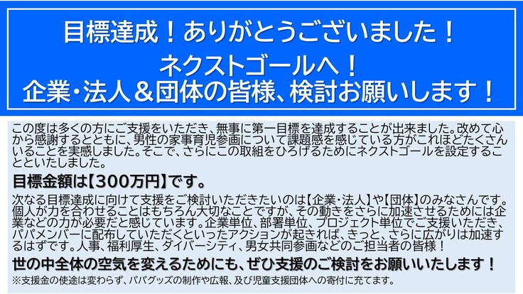 集まった支援はNPO法人ファザーリング・ジャパンがグッズ制作、送付およびPAPATOプロジェクトの周知拡大のため広報や販路拡大のための費用、また、児童支援に関わる団体への寄付として使います。
