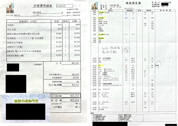 そこで、症状から、FIPを強く疑われ、再度血液検査と猫コロナウィルス遺伝子検査を受けました。